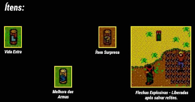 Um detalhe que, no início, vai estranhar bastante: o Rambo só dispara para a Frente (e Diagonais). Se colocar o direcional para Baixo (e Diagonais Inferiores) ele fará "Strifes", o movimento de andar de lado atirando. Para isto, você tem a disposição os ataques com o Botão 1 (Metralhadora) e o 2 (Flechas Explosivas).